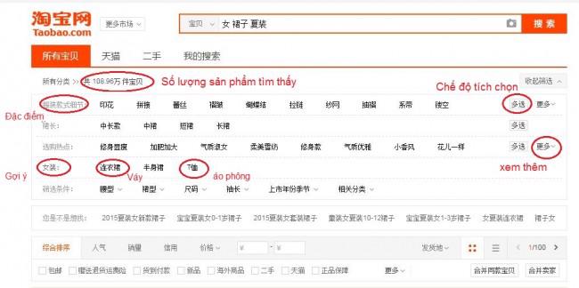 Sau khi đã có từ khóa bằng tiếng Trung, bạn dán từ khóa vào thanh tìm kiếm ở trang web. Kết quả hiện ra sẽ có rất nhiều sản phẩm liên quan đến từ khóa tìm kiếm, do đó bạn cần chọn lọc những sản phẩm thật sự phù hợp bằng cách sử dụng bộ lọc ngay phía dưới thanh tìm kiếm. Tùy theo các sản phẩm bạn tìm kiếm mà sẽ có bộ lọc với các thuộc tính không giống nhau. Ngoài ra, bạn nên nhập vào khoảng giá mong muốn (theo đơn vị là nhân dân tệ) và khu vực địa lý (thường là Quảng Châu) để thuận tiện cho việc đặt hàng Taobao giá rẻ.