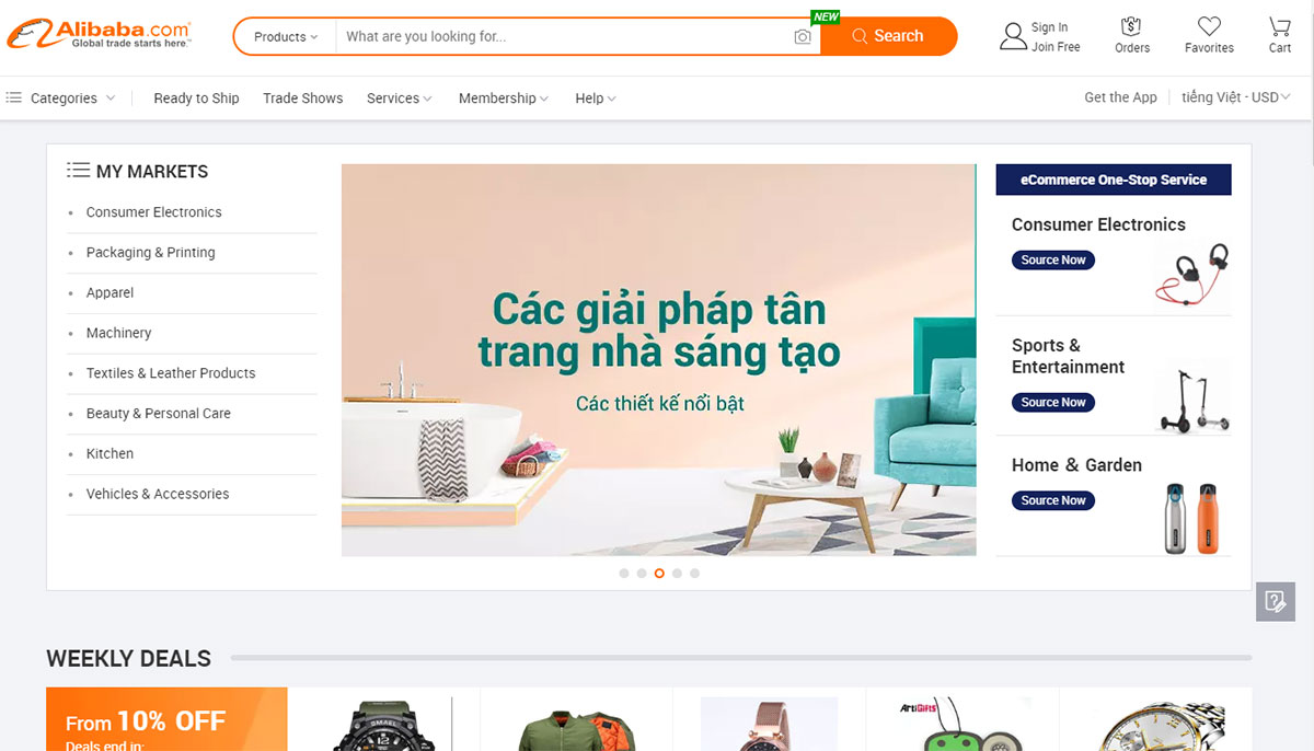 Alibaba hỗ trợ nhiều ngôn ngữ, đăng ký tài khoản dễ nhưng thời gian nhận hàng rất lâu. Các mặt hàng kinh doanh trên Alibaba.com